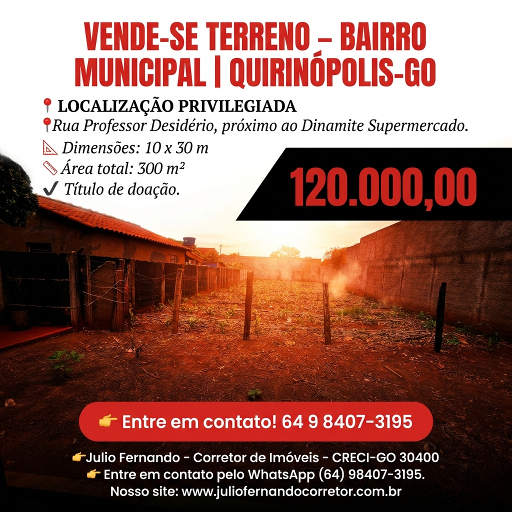 VENDE-SE TERRENO – BAIRRO MUNICIPAL | QUIRINÓPOLIS–GO