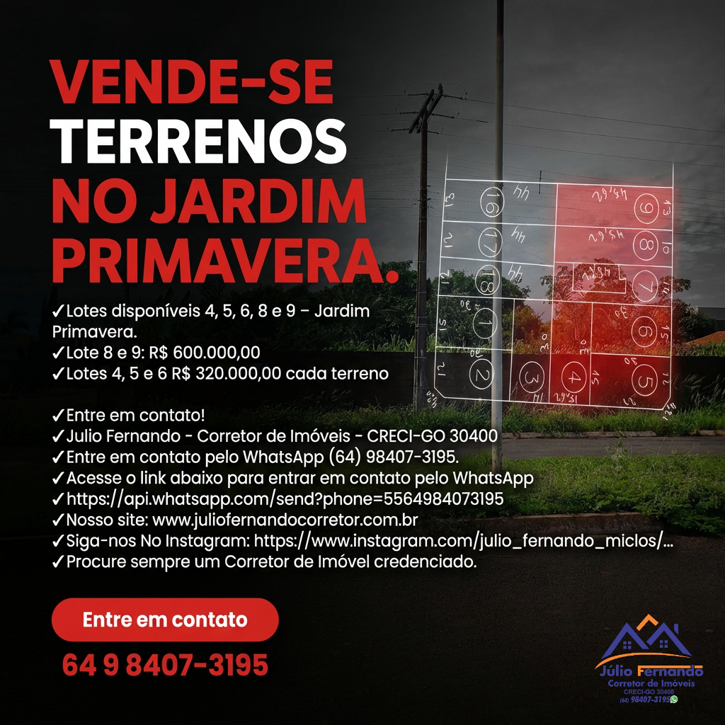 Lotes disponíveis 4, 5, 6, 8 e 9 – Jardim Primavera.