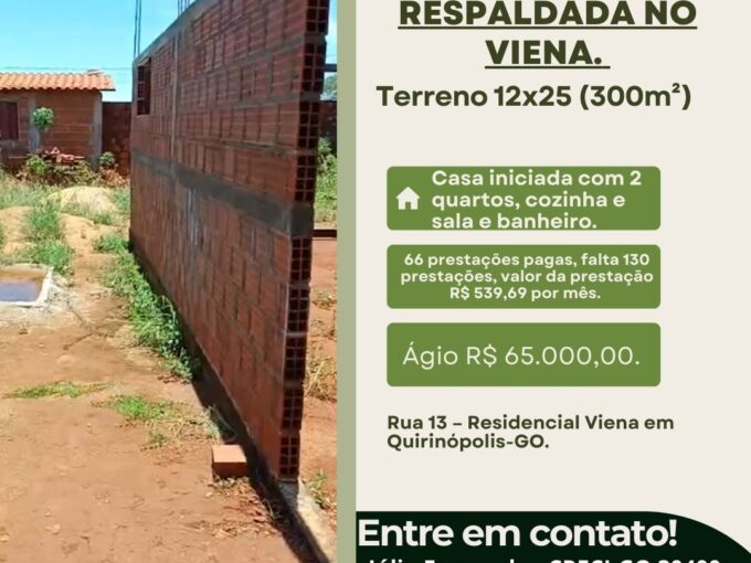VENDE-SE TERRENO COM CASA RESPALDADA NO VIENA. Terreno 12×25 (300m²)…