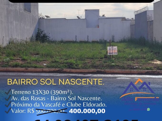 VENDE-SE TERRENO NO BAIRRO SOL NASCENTE. Terreno 13X30 (390m²). Av.…